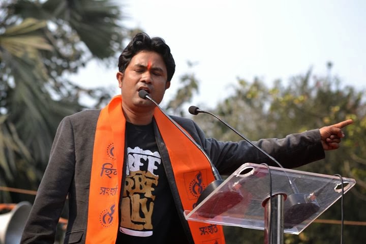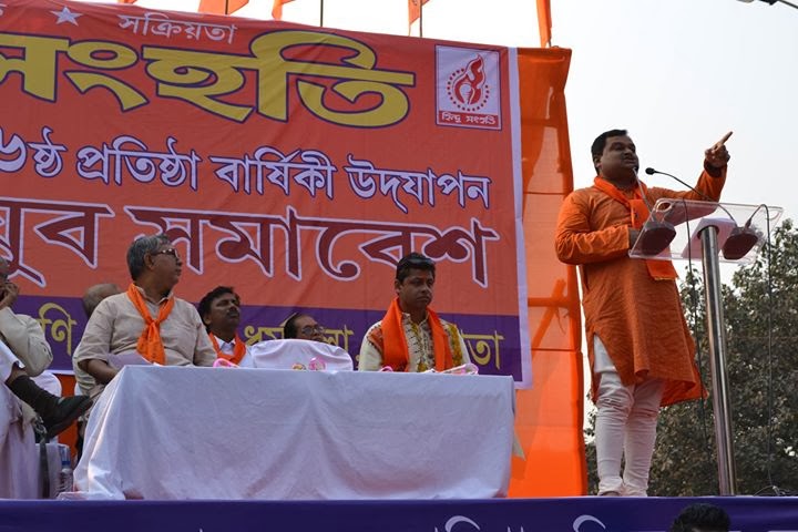 Strength and Stamina to Struggle begets Success –finest portrayal of this globally acclaimed gospel got apparent in the 6 th anniversary of Hindu Samhati in Rani Rashmani Avenue at Esplanade/Dharmatala, Kolkata on February 14, 2014 before the presence of more than tens of thousands of its supporters and millions of speculative bystanders across the globe. It is needless to say, no stone is left unturned every year to halt the anniversary of Hindu Samhati; similar endeavors had surfaced in this year too but the escalating endurance of Hindu struggle overpowered its foes, both in administrative and political arenas, ultimately. What happened on the day was nothing except a Festival of the Masses before the presence of stalwarts of Hindu struggle across India. People who graced the occasion included Tapan Ghosh (President, Hindu Samhati); Bikarna Naskar (vice-president, Hindu Samhati); Suresh Chavanke (Chairman, Sudarshan News Channel); Suryakant Kelkar (National Convenor, Bharat Raksha Manch); Swami Tejasanandaji Maharaj (Bholagiri Ashram, Haridwar).