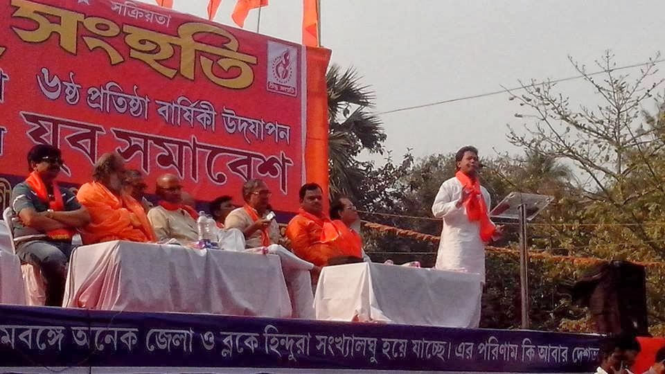 Shri Tapan Ghosh stated straight-from-the-shoulder and depicted how administration, ever since the formation of Hindu Samhati, has been impeding it religiously and behaves as if Hindus are second grade citizens in the country. This year too, like other years, several attempts were made to forbid Samhati from conducting its anniversary and it crossed all limits when the organization was asked to collect the no-objection certificate from Army headquarter, a fact that even surprised the authority there. But Muslim organizations are never behaved with thus and this proves best the condition of law-abiding Hindus in Bengal. Narrating a few heart rending attacks on Hindus by Islamists of late, especially in the rural areas, Shri Ghosh made it clear that ineptitude, morally degraded and subservient police can never save Hindus in Bengal and therefore, if Hindus want to exist, they have to be self-reliant and prepare themselves for violent struggles that can occur anywhere and at anytime.