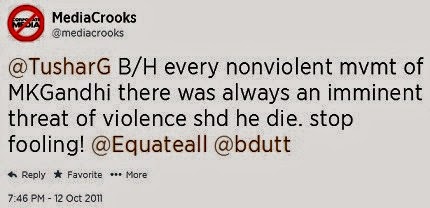 As if all that wasn’t enough, the judge on the show is none other than Congress pimpVinod Sharma. This guy is one sick man who shouldn’t be in the media or TV at all. He lectures the Yogi on virtues of peaceful living and how a nation cannot be run on “hate” and so on. One pet canard that Fiberals like to spread is that MKGandhi would have been non-violent no matter what. This is sheer nonsense. Here is what I tweeted inOctober 2011 to his degenerate great grand-son who scavenges in the name of Gandhi: