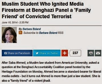 In another event of the Heritage Foundation over the killing of the American Ambassador in Benghazi a similar incident happened. A Muslim argues that all Muslims cannot be tarred with the brush of terrorism. Actually, nobody even tarred any Muslim or talked about Muslims in that meeting. But she got a severe answer from a panellist, Bridget Gabriel. Watch the video (5.49 minutes):