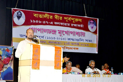 A fully packed Mahajati Sadan auditorium signaled the success of Hindu Samhati’s attempt to commemorate the glorious acts of Gopal Chandra Mukherjee after the infamous Direct Action day. On 16th of August, 1946, he valiantly took up arms in defense of fellow Hindus in Kolkata gainst the pro-Islamic government Bengal that schemed to uproot Hindus from Kolkata and its neighborhood. 68 years later on the same date, members of Hindu Samhati as well as ordinary citizens of Kolkata and suburbs gathered at Mahajati Sadan with a single mission to honor the great hero of Bengal and pay homage to his services on that fatef Swami Pradiptanandaji Maharaj from Bharat Sevashram Sangha, Prof. Saradindu Mukherjee from Delhi University, Ashok Mal and several others including relatives of Gopal Chandra Mukherjee. The convention was presided by Tapan Ghosh, president of the Hindu Samhati.