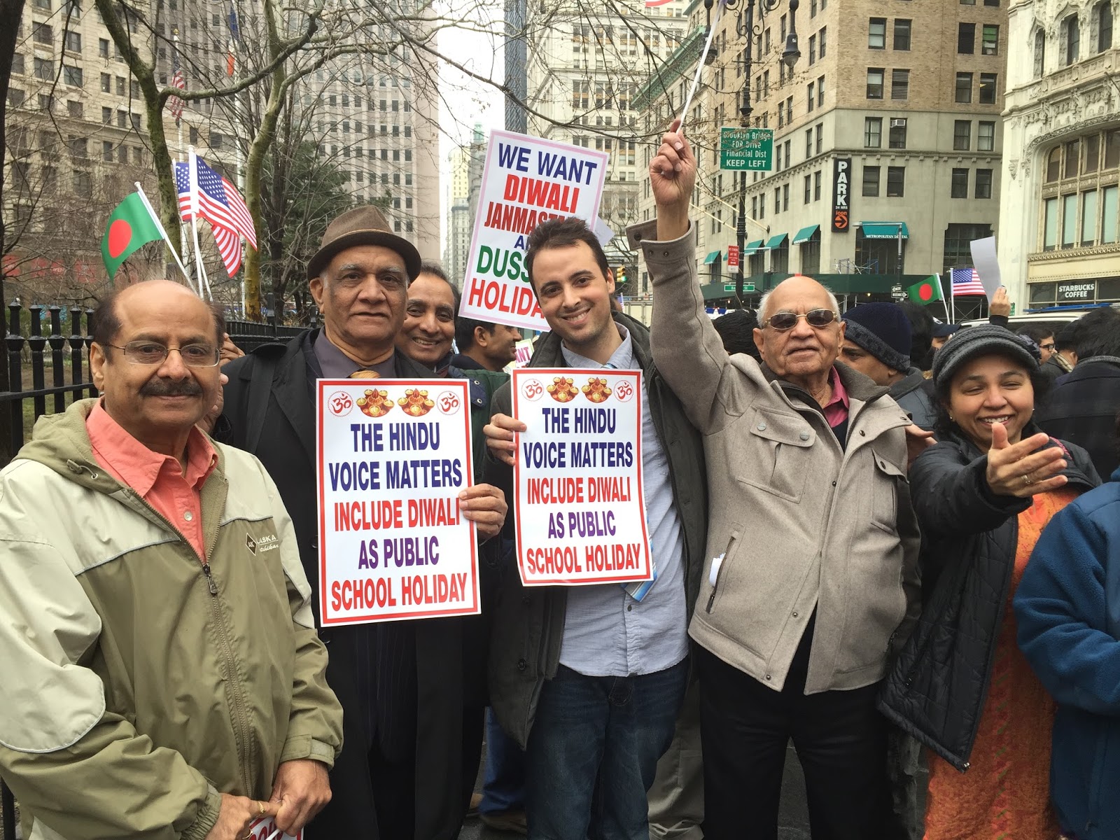 Our group continued to petition the mayor’s office and hold meetings in temples to promote the Hindu Holidays Campaign. We also realized that if we were going to get the powers that be to listen to us and take us seriously, we need to organize for mass action to show that we were a united community who was determined to be included and respected, just like everyone else. With some advice from other political activists, we began the “Take Day Off Holi Campaign”. This was a movement to get NYC and New Jersey Hindus to stay home from work and school on Holi so as to show governmental administrators we were serious. We also realized that empty seats = votes, and so our absence would say much to those who were seeking our support at the ballot box and financially. Eventually after much agitation, the mayor’s office held its first Diwali event in the fall of 2016, which I attended. (See Video) Also some Long Island school districts began adding Diwali to their individual holiday calendars.