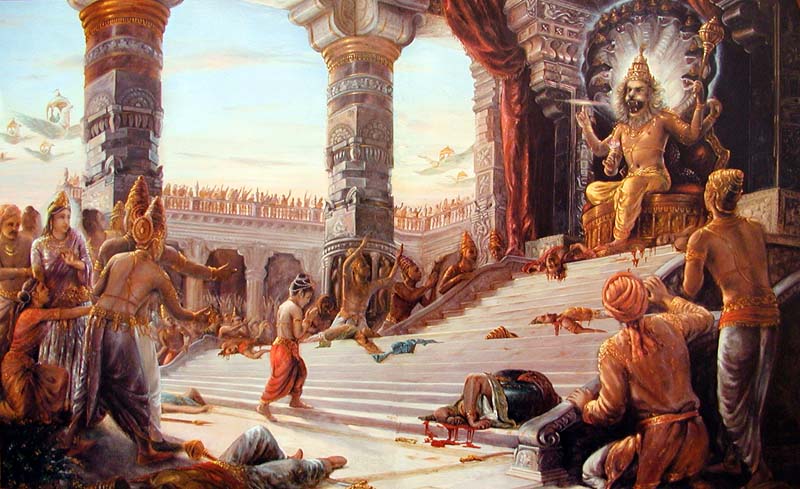When Hiranyakashipu saw that Prahlad had survived the flames, he became enraged and charged Prahlad to kill him. But Lord Vishnu burst out of a temple pillar in the form of Narashima, the man-lion avatar, and ripped Hiranyakashipu limb from limb.